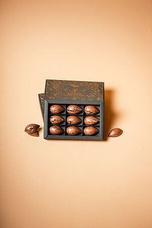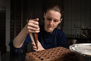 Für die Speck-Pralinés braucht Hanna Karthaus nur die besten Zutaten. Die Spezialitäten-Metzg Wetter aus Appenzell liefert den heissgeräucherten Kronbergspeck. Für diese Specksorte wird nur das hochwertigste Schweinefleisch aus der Region und nur von ausgesuchten Bauern verwendet. Die Milchschokolade stammt von Felchlin, Hanna nimmt dafür die Grand Cru Couverture Maracaibo 38 %. Die Schokolade wird mit dem gebratenen Speck infusiert, damit sie den Geschmack annimmt. Zusätzlich werden noch kleine getrocknete Stücke in die Schokolade gegeben. Die sorgen für einen schönen Knuspereffekt.