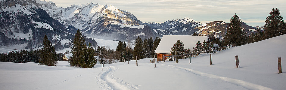 Die Winterwanderwege und Schneeschuhrouten sind in der ganzen Schweiz mit der Farbe Pink markiert und ausgeschildert.