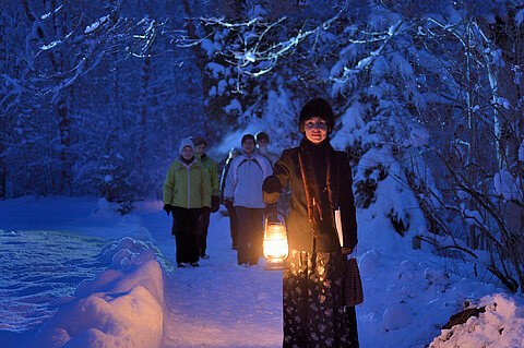 Gemütlicher Spaziergang durch den winterlichen Wald. Dabei erzählt die Begleiterin Sagen im Innerrhoder Dialekt